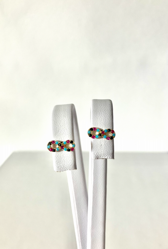 Złote kolczyki nieskończoności z białymi i różowymi cyrkoniami / Próba 585