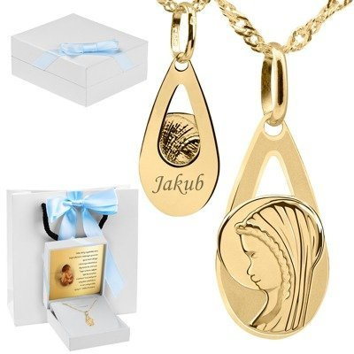 Złoty medalik z Matką Boską w kształcie łzy pr. 585 Pamiątka Chrzest Komunia Bierzmowanie Grawer różowa kokarda