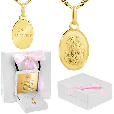 Srebrny medalik z Matką Boską Częstochowską, pozłacaną i łańcuszkiem / pr. 925 / Grawer / różowa kokardka