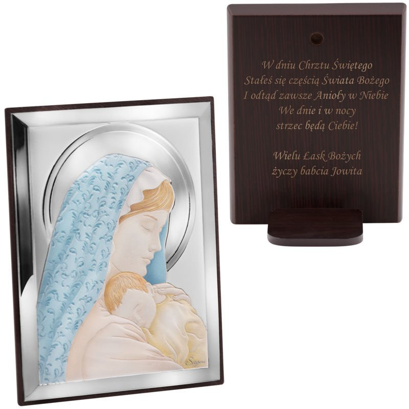 Pamiątka Chrztu Św. obrazek Madonna z Dzieciątkiem z grawerem