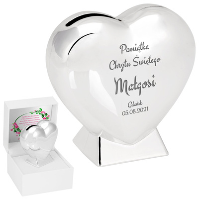 Srebrna skarbonka serce pamiątka na chrzest z grawerem i dedykacją