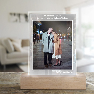 Podświetlana ramka LED z akrylu na drewnianej podstawie z personalizacją