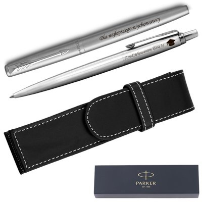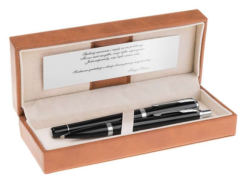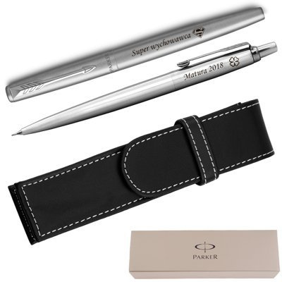 Eleganckie i efektowne zestawy piśmienne marki Parker to perfekcyjny pomysł na prezent na różne okazje. Tak ekskluzywne przybory do pisania można podarować członkom rodziny, przyjaciołom, partnerom biznesowym, współpracownikom lub nauczycielom. Zestaw przyborów do pisania jest uniwersalnym i ponadczasowym upominkiem, który jednak staje się niezwykle osobisty za sprawą grawerowania. Oferowane przez nasz sklep zestawy piśmienne Parker można ozdabiać przy pomocy grawerunku. Długopisy i pióra mogą przecież zawierać inicjały, imiona, symbole, logotypy lub krótkie sentencje, które uczynią je przedmiotami o wyjątkowym znaczeniu. Przybory są zapakowane w efektowne etui, w którym można zamieścić dodatkową plakietkę z dedykacją – wszystkie te elementy są wliczone w cenę produktu. Zestawy prezentowe Parker to ponadczasowy pomysł na prezent z okazji urodzin, imienin, dnia nauczyciela, jubileuszu pracowniczego i z wielu innych okazji. Można również wybrać jeden z zestawów dla siebie, by mieć do dyspozycji najlepsze przybory do pisania z efektownym opakowaniem i grawerunkiem.