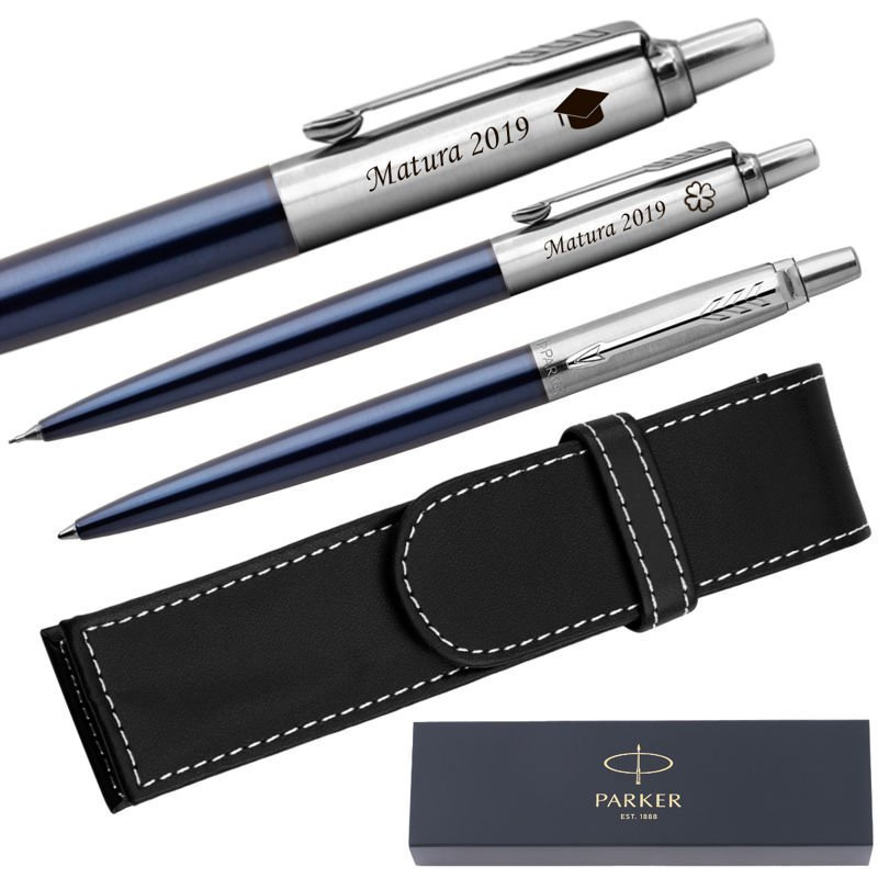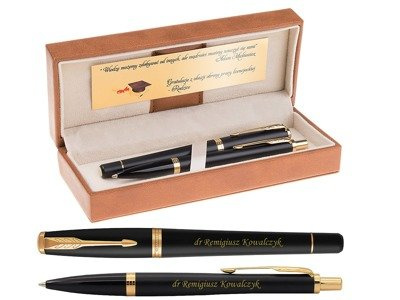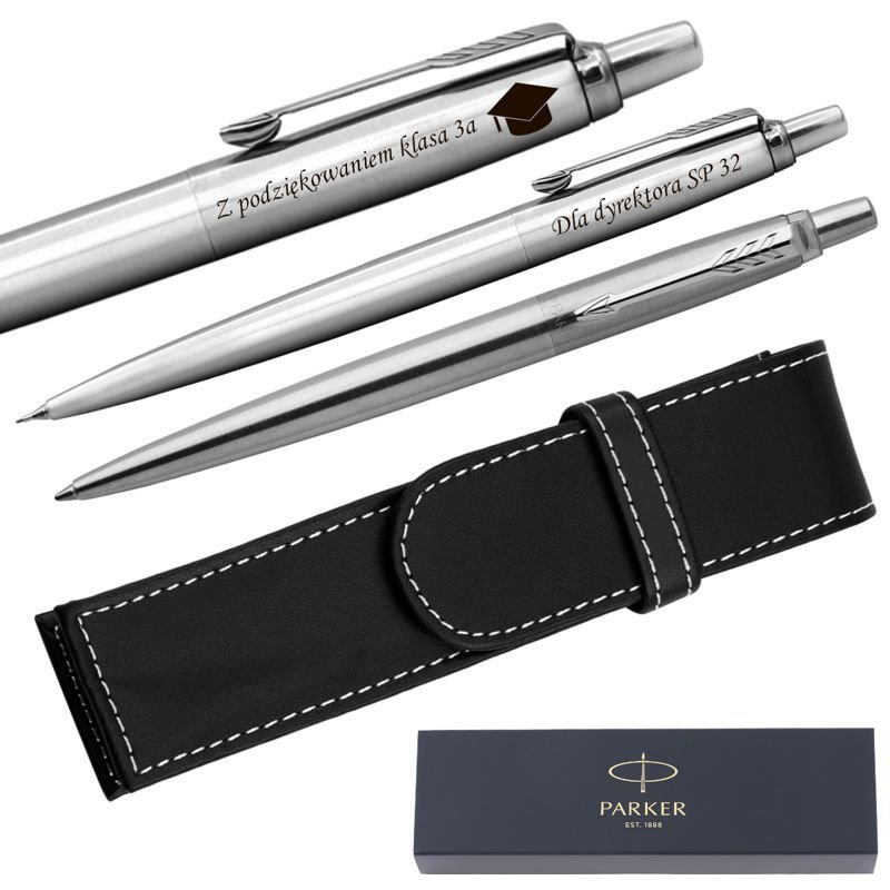 Eleganckie i stylowe zestawy piśmienne Parker | Zestaw ekskluzywnych przyborów do pisania to uniwersalny i absolutnie ponadczasowy prezent. Mimo zmieniającej się rzeczywistości i postępującej cyfryzacji wielu obszarów życia, odręczne pisanie, a w szczególności przy pomocy eleganckiego pióra lub długopisu, wciąż ma swój urok i szerokie zastosowanie. Bez względu na piastowane stanowisko, wiek, płeć lub doświadczenia życiowe, każdy ucieszy się na widok efektownego upominku w postaci zestawu piśmiennego Parker. Przybory do pisania marki Parker to przedmioty z duszą i niezwykłym rodowodem. Ta marka jest symbolem i synonimem wysokiej jakości, niezawodnego działania i niekwestionowanej elegancji. W ofercie naszego sklepu można nie tylko kupić przybory do pisania Parker, ale także nadać im osobisty i niepowtarzalny charakter za pomocą grawerowania. Ekskluzywne pióra i długopisy marki Parker można ozdobić dowolnym grawerunkiem i wręczyć je w charakterze upominku. To doskonały pomysł na prezent zarówno dla bliskich, jak również w charakterze upominku biznesowego. Każdy z zestawów jest wyposażony w efektowne i gustowne etui, w którym można zamieścić tabliczkę z dedykacją, a same przybory do pisania ozdobić pamiątkowym grawerem, który jest wliczony w cenę produktu. Etui jest idealnie przystosowane do wymiarów przyborów piśmienniczych oraz elegancko wyściełane, co nadaje całości jeszcze więcej klasy, szyku i elegancji. Pomysłem na prezent urodzinowy, imieninowy, jubileuszowy lub biznesowy może być właśnie zestaw piśmienny marki Parker. Asortyment tych zestawów jest bardzo szeroki i zróżnicowany. Można wśród nich znaleźć propozycje w sam raz dla mężczyzn, dla kobiet, dla osób o klasycznym guście, jak również dla tych, którzy preferują nowoczesny design. Zestawy piśmienne marki Parker, za sprawą grawerowania, zyskują unikatowy charakter. Długopisy i pióra można ozdabiać imionami, inicjałami, logotypem lub wybranymi sentencjami sprawiając, że przedmioty te będą jedyne w swoim rodzaju.