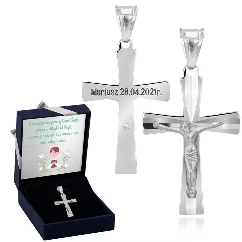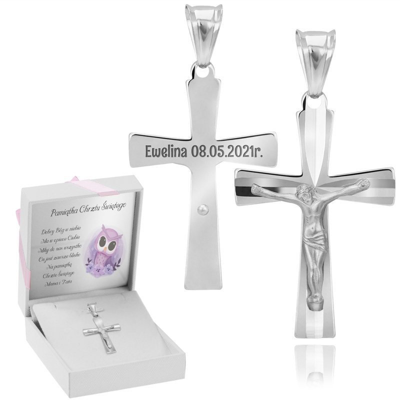 Srebrny 925 Krzyżyk z Jezusem Chrzest Komunia Bierzmowanie Grawer