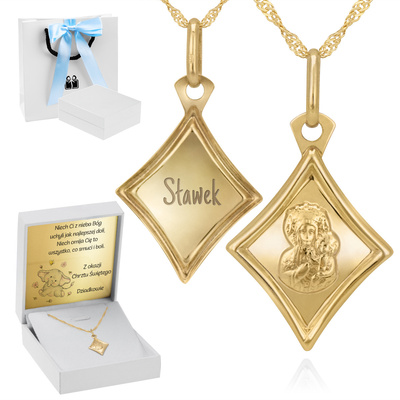 Złoty medalik 585 łańcuszek Matka Boska Prezent na chrzest I Komunię Św. Grawer