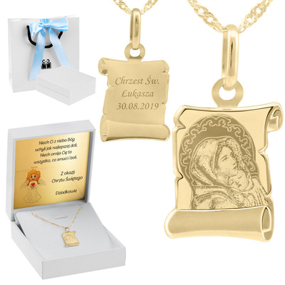 Złoty medalik z łańcuszkiem próba 585 Matka Boska z Dzieciątkiem Chrzest Komunia Grawer