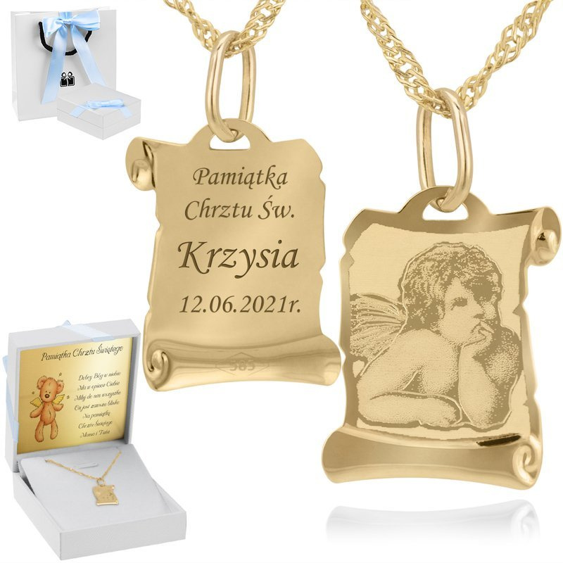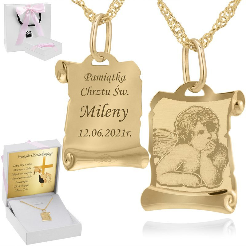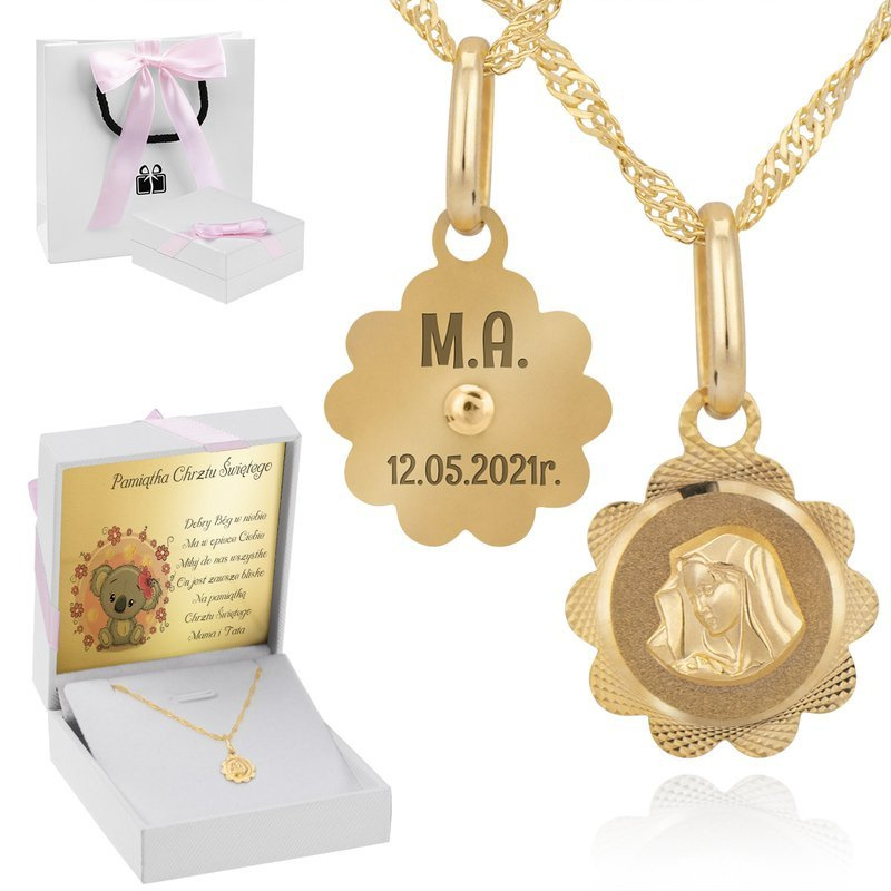 Złoty medalik z łańcuszkiem próba 585 z wizerunkiem Matki Boskiej Chrzest Komunia Bierzmowanie Grawer