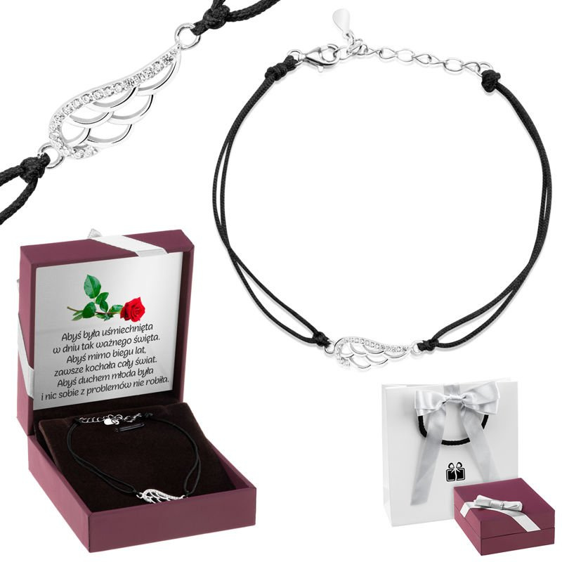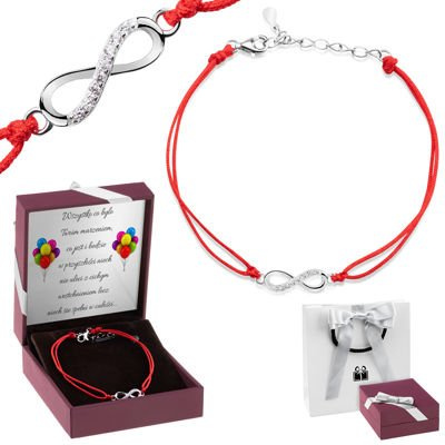 Bransoletka Nieskończoność z cyrkoniami na czarnym sznurku Srebro 925 Dedykacja