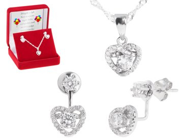 Srebrny komplet z cyrkoniami pr. 925 kolczyki i wisiorek Serduszka DEDYKACJA