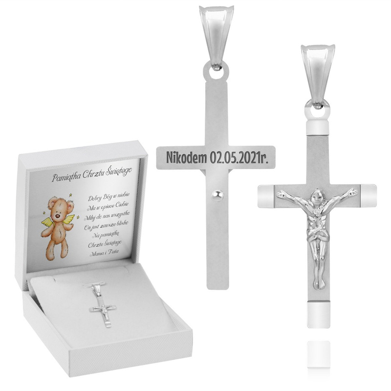 Srebrny 925 Krzyżyk z Jezusem Chrzest Komunia Bierzmowanie Grawer