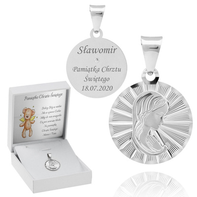 Srebrny medalik z Jezusem pamiątka Chrztu Św. Dedykacja