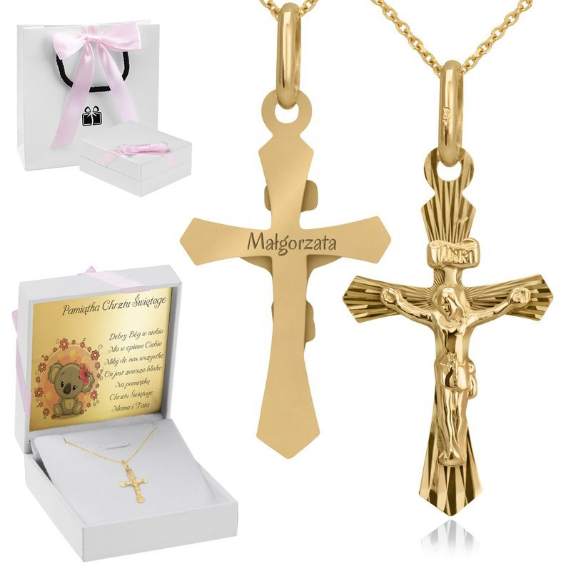 Złoty medalik z łańcuszkiem próba 585 Matka Boska z Jezusem Chrzest Komunia Grawer