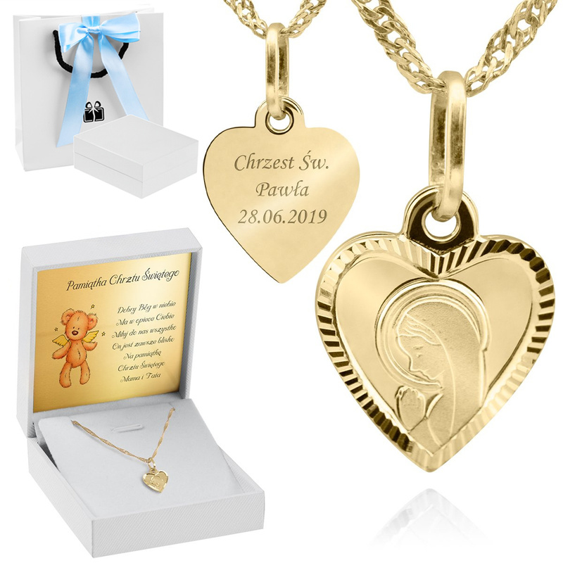 Złoty medalik łańcuszek Matka Boska serduszko pr. 585 Chrzest Komunia Grawer