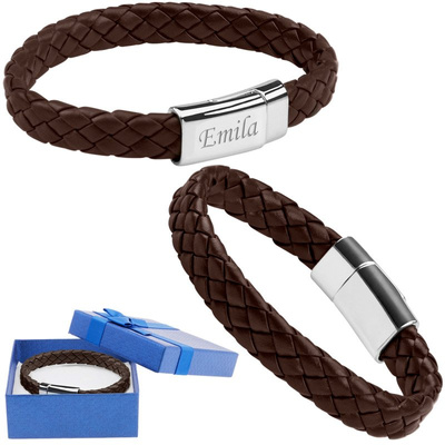Brązowa bransoletka stal 316L i eko skóra z grawerem na zapięciu