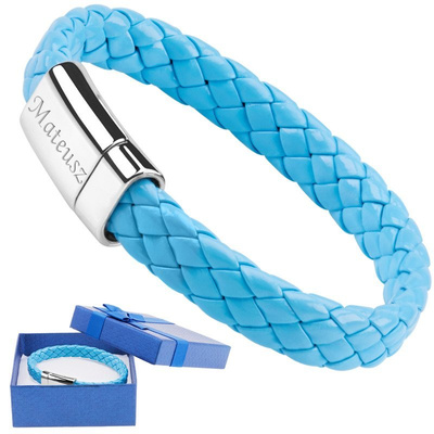 Błękitna bransoletka stal 316L i lakierowana eko skóra z grawerem