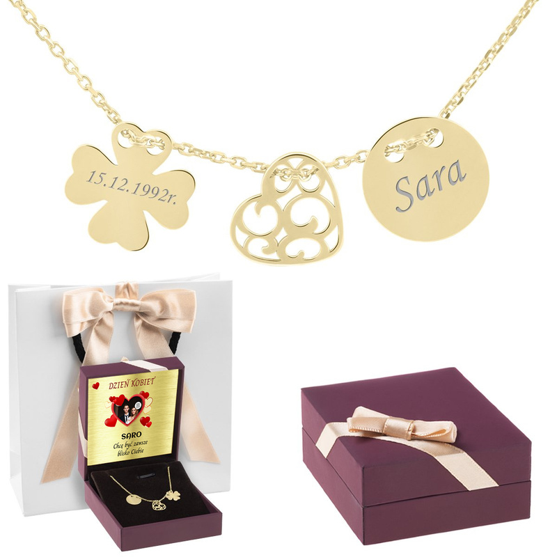 Pozłacany naszyjnik pr.925 koniczynka serce kółko z grawerem