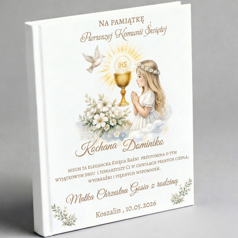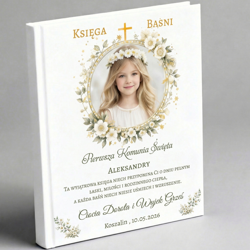 Księga Baśni ze zdjęciem na Pierwszą Komunię Świętą – personalizowana pamiątka dla dziewczynki z dedykacją