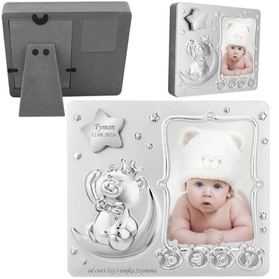 Ramka z pozytywką Miś na Chrzest i Roczek z grawerem