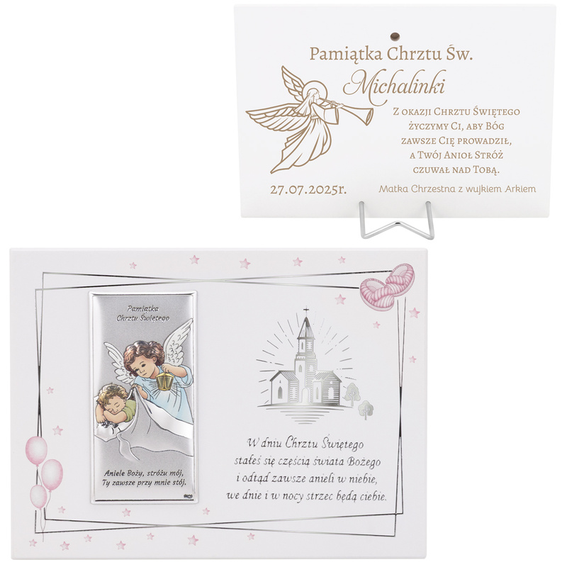 Pamiątka Chrztu Świętego – Posrebrzany Obrazek Aniołka na Białym Panelu z Dedykacją