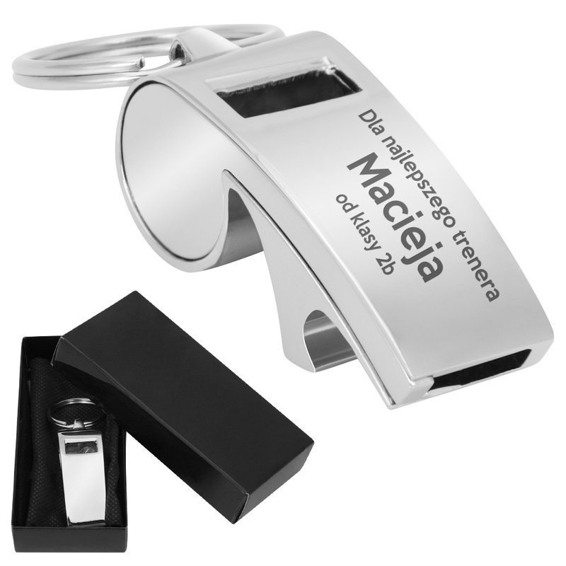 Metalowy brelok z gwizdkiem na klucze o wysokim połysku z grawerem