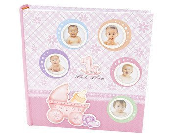 Album Różowy butelka, buciki, smoczek, wózek i grzechotka 10 x15 prezent na chrzest z grawerem