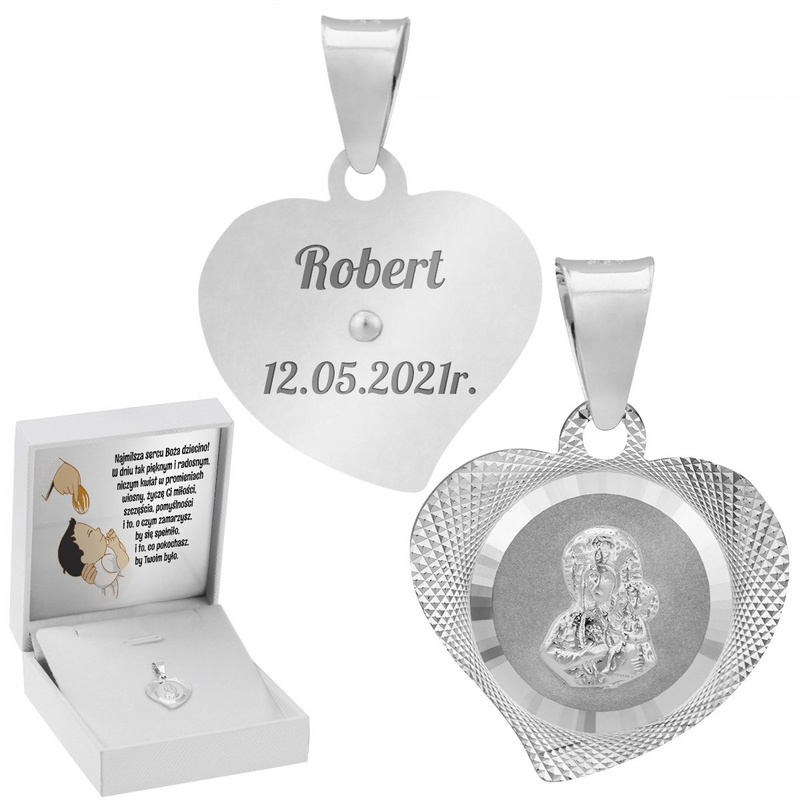 Srebrny Medalik z Matką Boską W Sercu Z Dedykacją