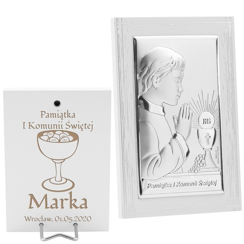 Obrazek Srebrny Chłopiec Pamiątka na I Komunię Św. Grawer 9x13,5 cm