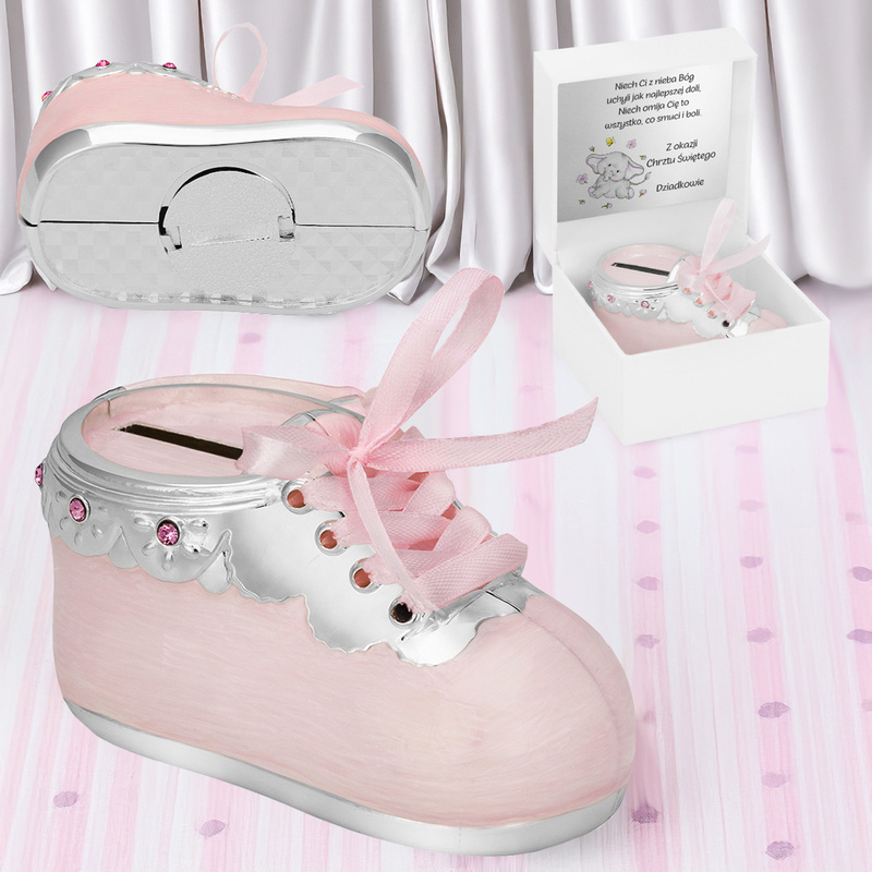 Skarbonka Różowy bucik / Prezent na chrzest z dedykacją