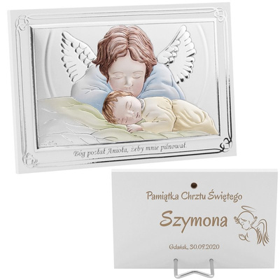 Obrazek srebrny Anioł Stróż w niebieskiej ramce pamiątka chrztu na chrzest z Dedykacją