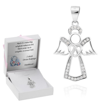 Anioł stróż 925 z cyrkoniami i tabliczką z dedykacją na Chrzest