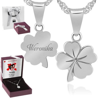 Wisiorek koniczynka pr. 925 z łańcuszkiem, grawerem i tabliczką