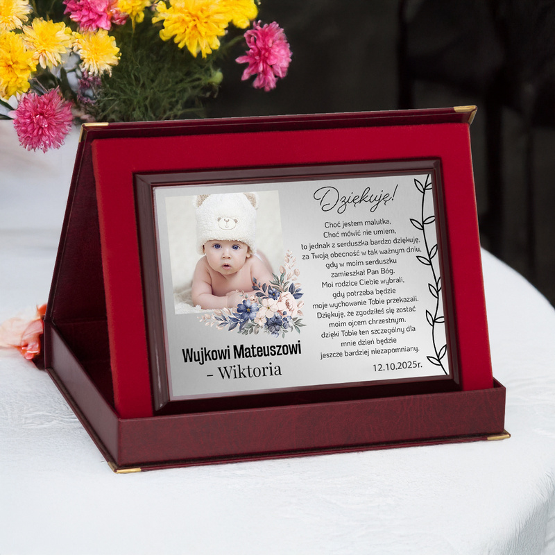 Podziękowanie dla rodziców chrzestnych / Drewniany panel, srebrna tabliczka, etui, dedykacja