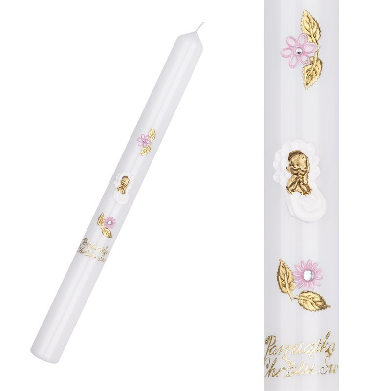 Świeca na chrzest różowo-złota niemowlę Pamiątka do chrztu