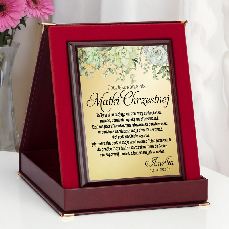 Podziękowanie dla matki chrzestnej / Drewniany panel, złota tabliczka, dedykacja