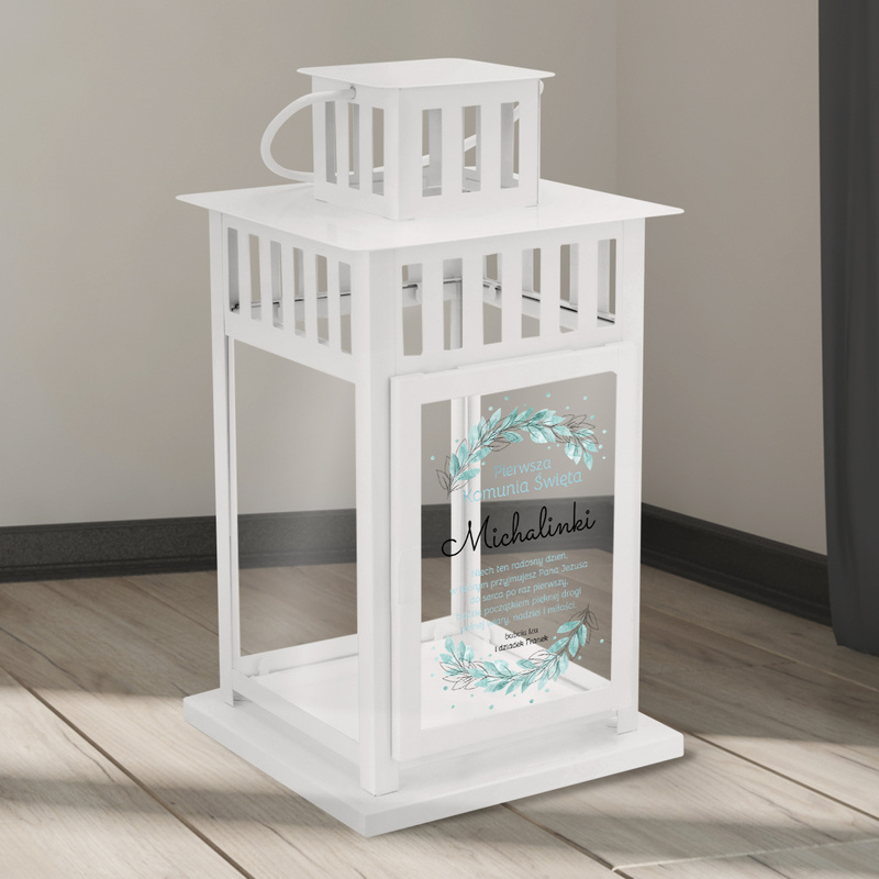 Personalizowany biały lampion – Pamiątka Komunijna z cytatem i pastelową grafiką