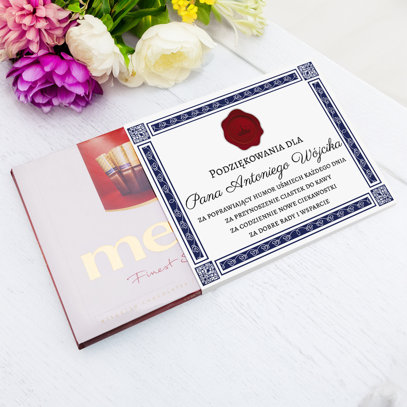 Zestaw Merci z personalizowaną obwolutą – podziękowania firmowe i na emeryturę