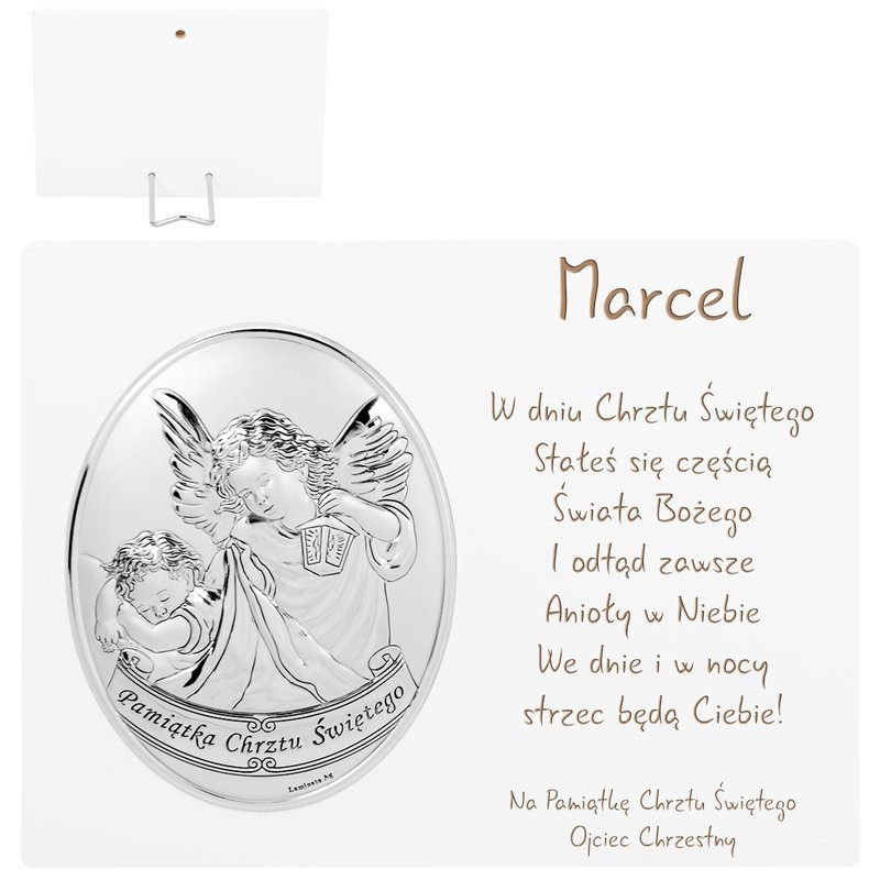 Obrazek Srebrny Anioł Stróż 14,3x7,3 cm Pamiątka Chrztu Grawer