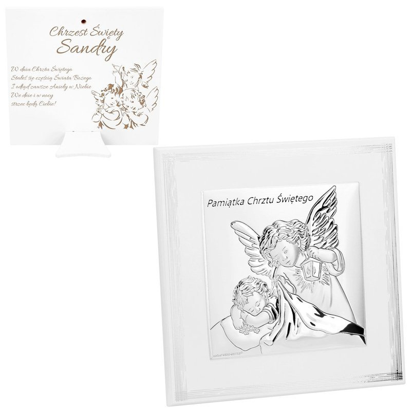Srebrny obrazek Anioł Stróż w panelu ecru z Grawerem