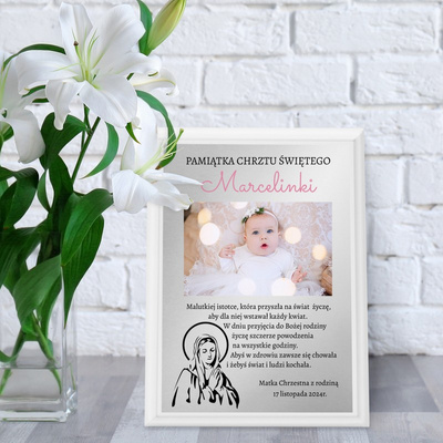 Pamiątka Chrztu Świętego - Biały Podkład ze Srebrną Tabliczką i Zdjęciem Dziecka