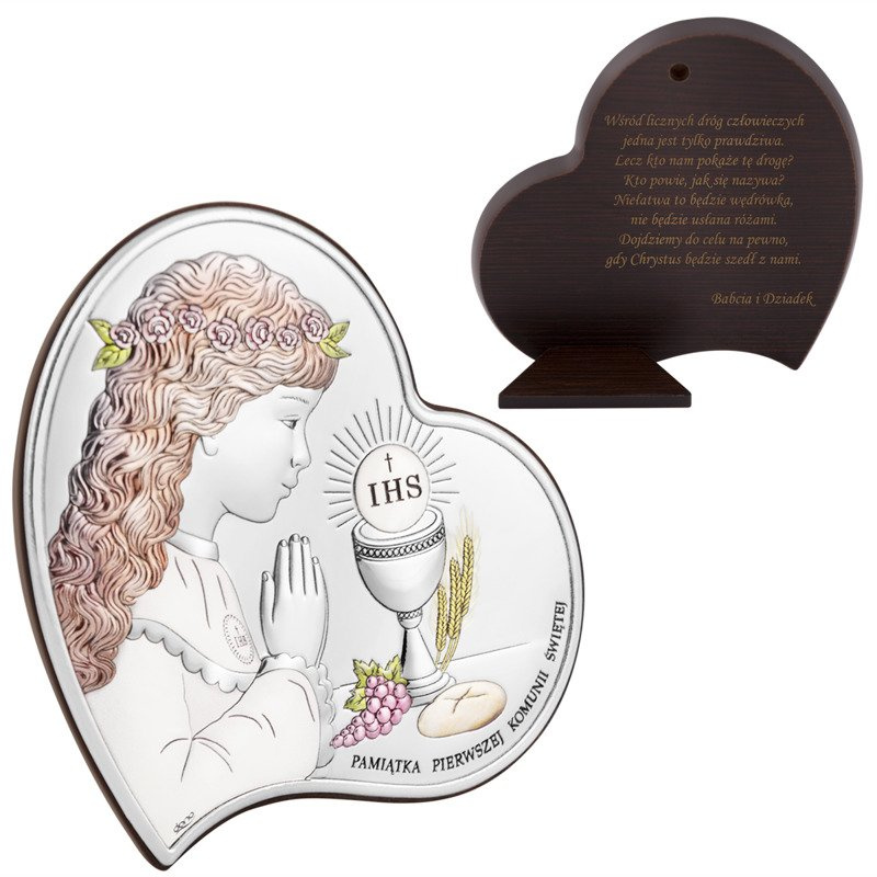 Komunia Św. obrazek serce dla dziewczynki srebrny z grawerem