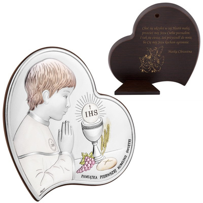 I Komunia Św. srebrny obrazek serce dla chłopca z grawerem