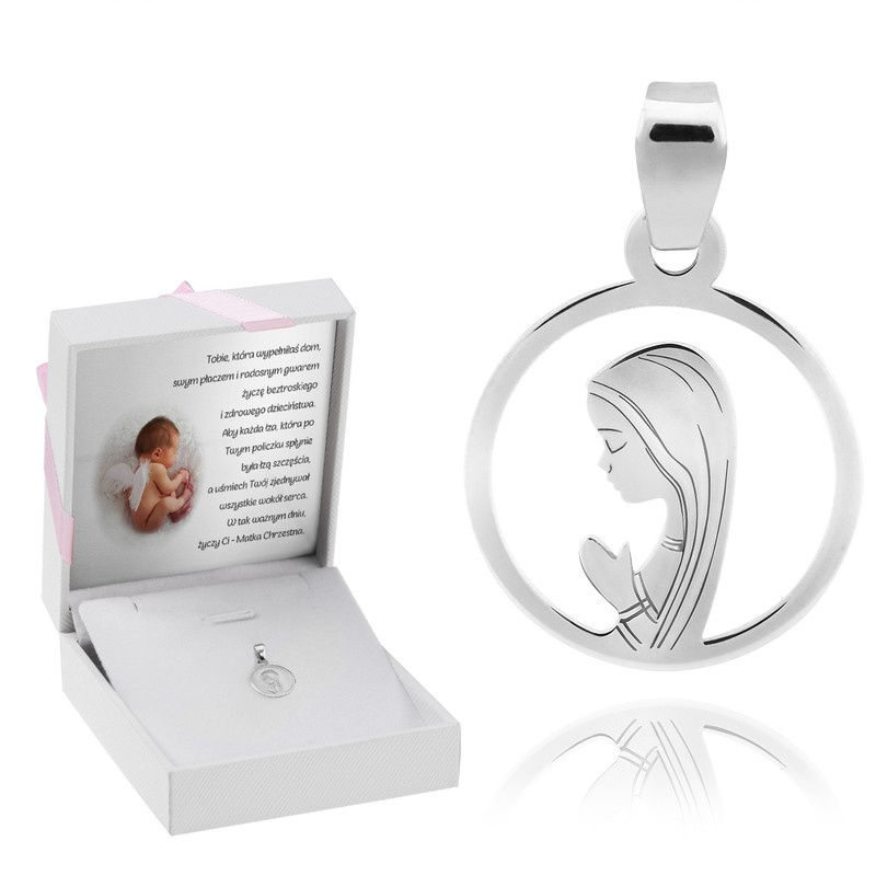 Srebrny medalik Matka Boska pr. 925 Dedykacja Chrzest