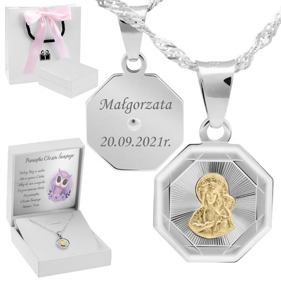 Zestaw: srebrny medalik z łańcuszkiem - pozłacana Matka Boska Częstochowska / Grawer / Chrzest Św. / I Komunia Św./ pr. 925 / róż.