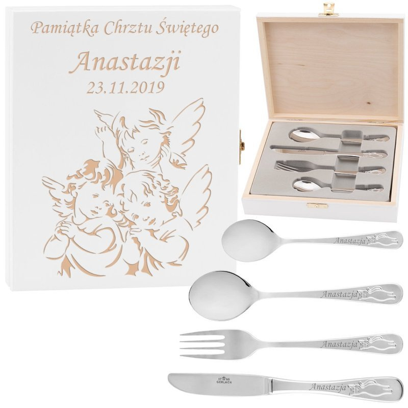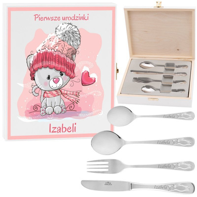 Sztućce dla dziecka Kotki w ozdobnym drewnianym pudełku z Grawerem