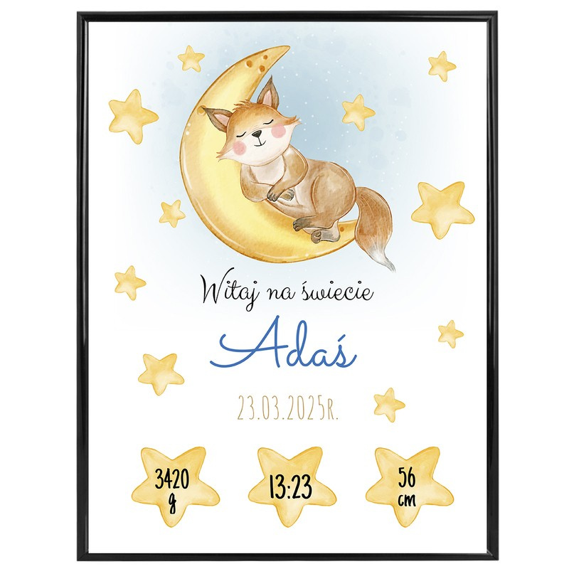 Plakat Metryczka / Księżyc i Gwiazdki / Prezent na Baby Shower / Plakat na narodziny dziecka / szkło