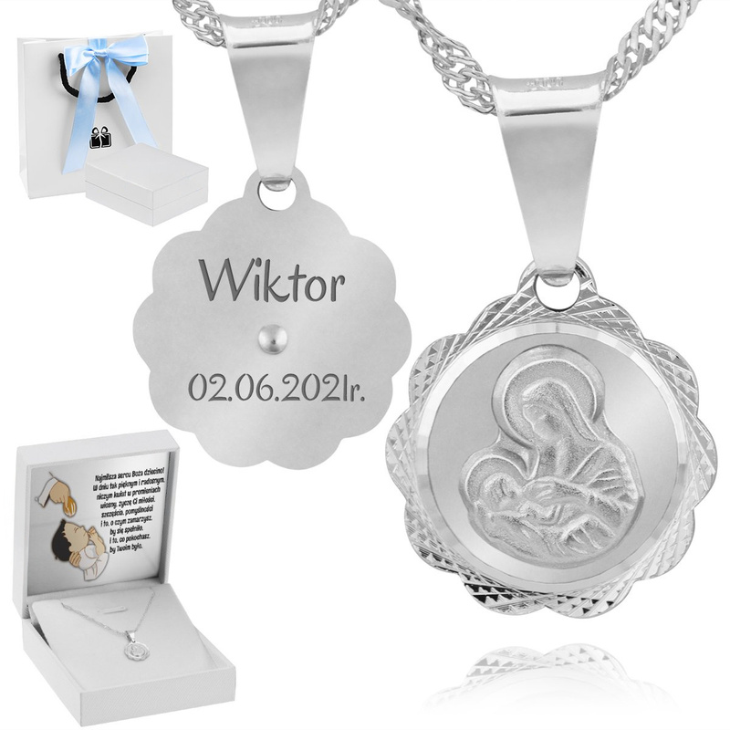 Srebrny medalik Matka Boska z dzieciątkiem Dedykacja