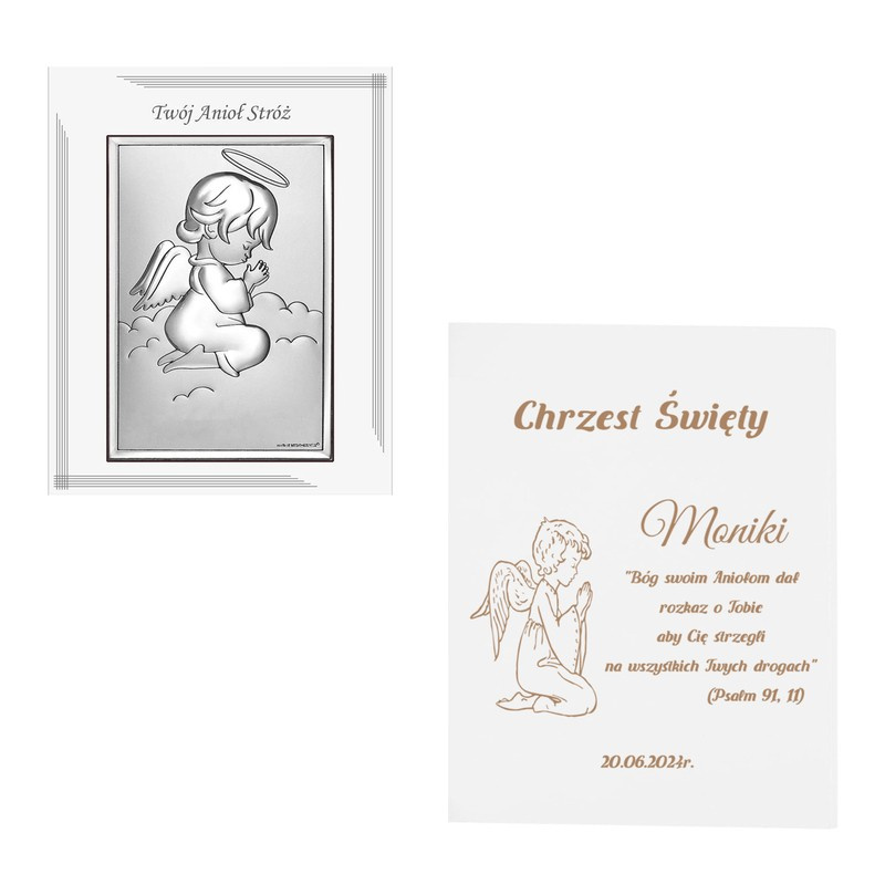 Obrazek posrebrzany /Obrazek Aniołek Na Białym Panelu/ Pamiątka Chrztu Św./Grawer/9x12cm