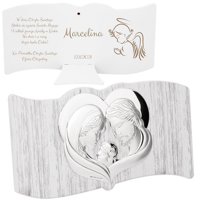 Srebrny obrazek Święta Rodzina na jasnym drewnie z grawerem