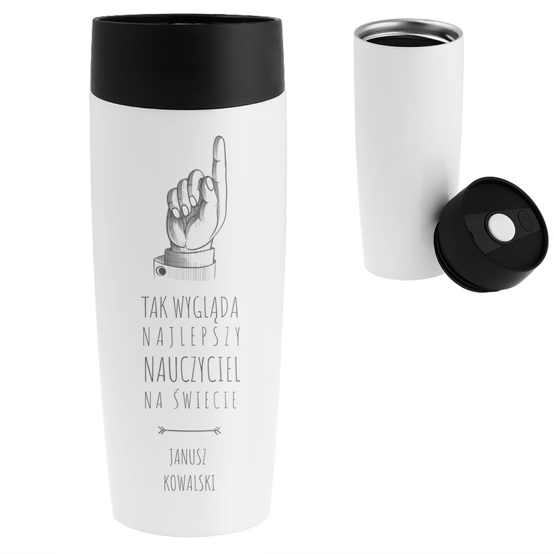 Na Dzień Nauczyciela biały kubek termiczny z grawerem laserowym